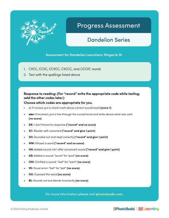 A progress assessment for students to complete that reviews CVCC, CCVC, CCVCC, and CCCVC words (Stages 8-10).