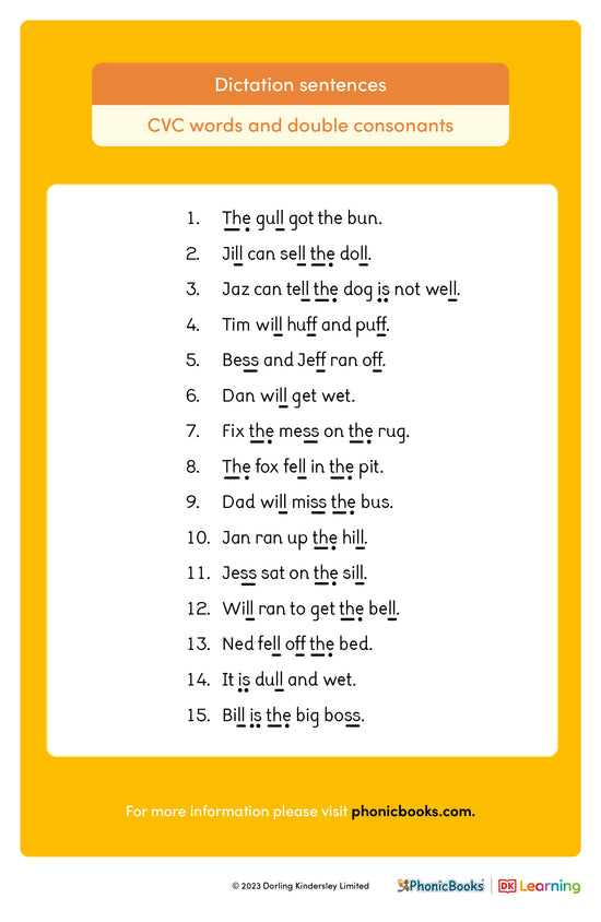 A poster of dictation sentences to help students practice writing CVC words and double consonants.