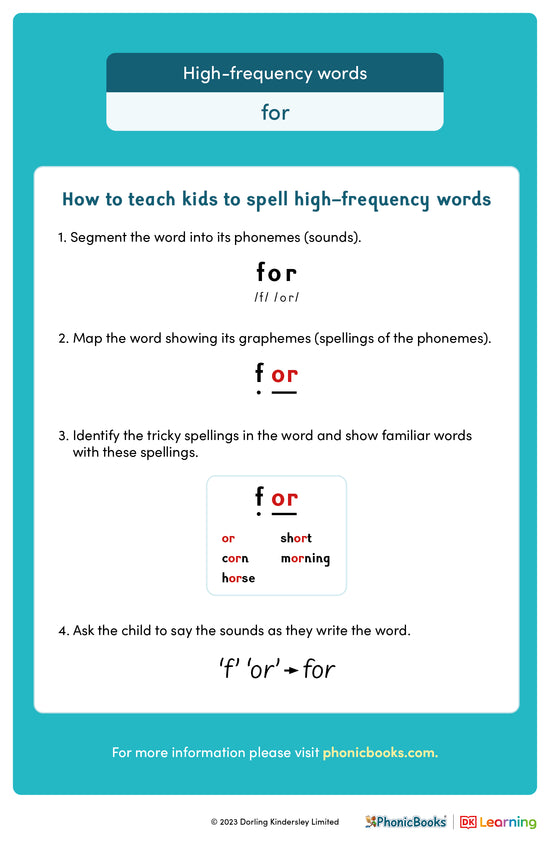 A poster to help students spell the high-frequency word 'for', using segmenting, grapheme labeling, identifying tricky and familiar words with the sound and asking students to say the sounds as they write the word.